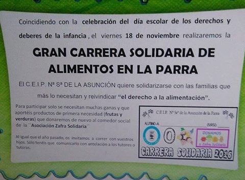 Un año más, el Colegio Público Nuestra Señora de la Asunción de la Parra, con motivo de la celebración del día escolar de los derechos y deberes de la infancia, organiza una carrera solidaria, recogiendo productos fresco para nuestro comedor social.