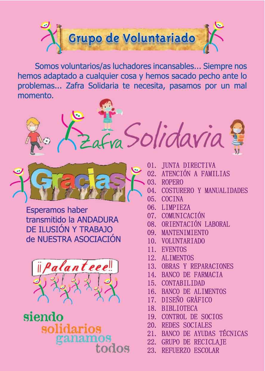 Para llevar a cabo esta campaña se han editado una serie de dípticos en los que se recuerda la trayectoria de Zafra Solidaria, el colectivo al que se ayuda y los 23 grupos en los que está dividido el voluntariado, formado por unas 500 personas incansables e ilusionadas, pese a las adversidades. La presidenta les agradeció su incansable labor, sin la que la ONG no podría funcionar.